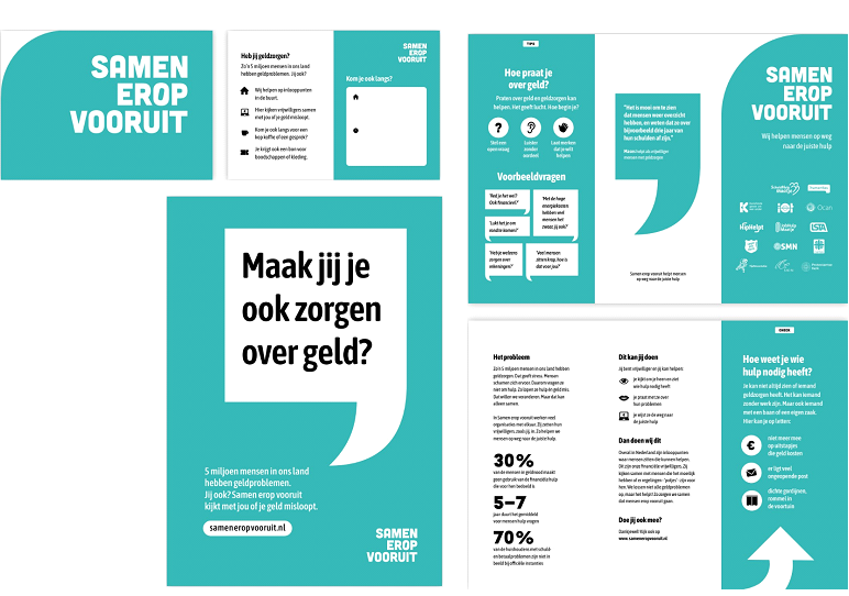 Je doet het niet alleen. Landelijk en lokaal zijn er meerdere organisaties aangesloten bij ‘Samen erop Vooruit’, zoals SchuldHulpMaatje, Leger des Heils en Humanitas. Vanuit deze samenwerking kunnen veel mensen bereikt worden en tevens kunnen we mensen makkelijker doorverwijzen, naar hulp biedende organisaties in de buurt. Ook als parochie of Caritas kun je praktische hulp aanbieden. Is er in jullie parochie geen inlooppunt, dan kun je doorverwijzen (maar je mag ook meegaan) naar een inlooppunt in de regio waar mensen naartoe kunnen om hulp te ontvangen, zie de link voor de aangesloten locaties https://sameneropvooruit.nl/inlooppunten/ - Flyers