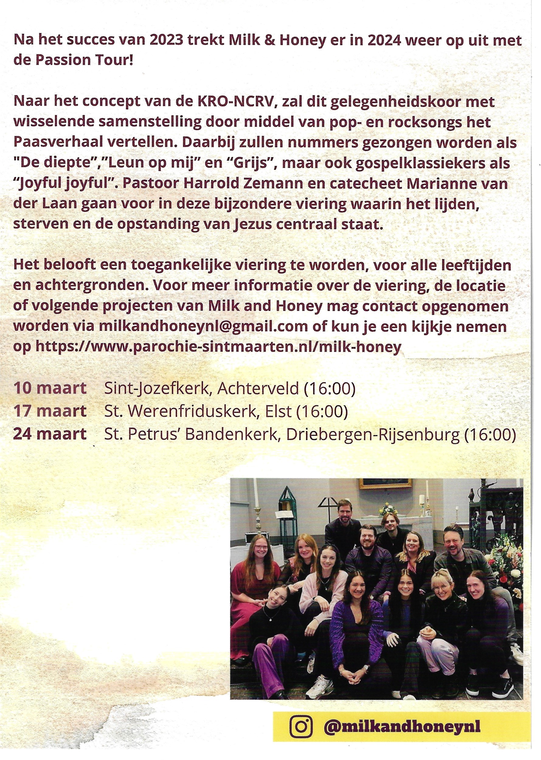 Een Muzikale Paasvertelling naar het concept van de KRO-NCRV, zal dit gelegenheid koor met wisselde samenstelling door middel van pop- en rocksongs het Paasverhaal vertellen. Daarbij zullen nummers gezongen worden als “De diepte”, “Leun op mij” en “Grijs”, maar ook gospelklassiekers als “Joyful joyful” Pastoor Harrold Zemann en catecheet Marianne van der Laan gaan voor in deze bijzondere viering waarin Lijden, sterven en de opstanding van Jezus centraal staat.