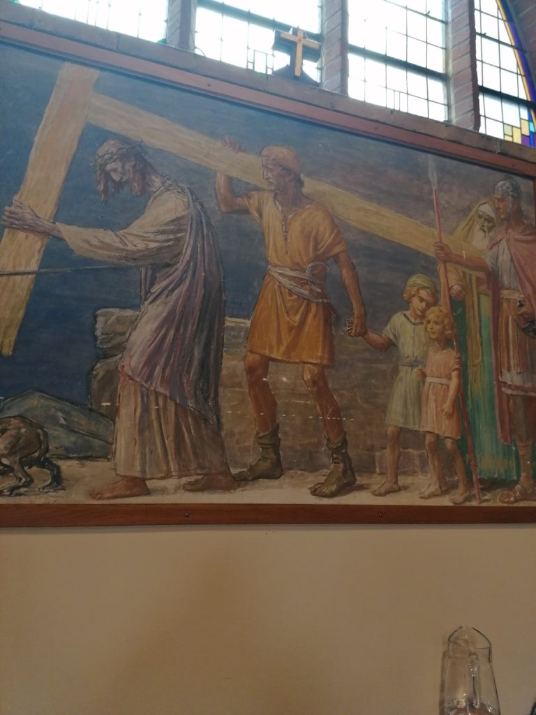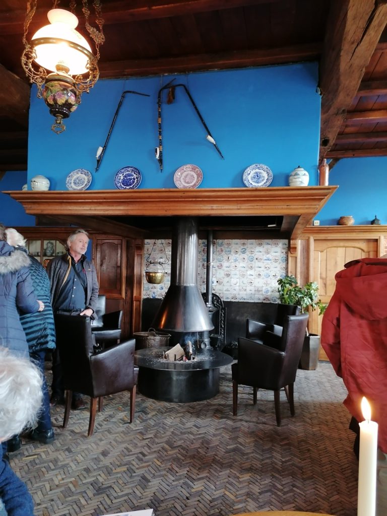 Tijdens de reis per touringcar naar het geboortedorp van pastor Harrold vertelde hij met veel humor over de Achterhoek, zijn dorp, het huis van zijn ouders, de kerk waar hij gedoopt was en zijn eerste viering had meegemaakt en wat we verder daar aan bijzonderheden zouden gaan bezoeken. Bij aankomst in Beltrum bij de OLV Ten Hemelopneming werden we opgewacht door pastoor Karel Donders en pastor Herman de Jong, de huidige pastoor van de geloofsgemeenschap. Een heerlijk kopje koffie stond klaar en aansluitend was er een mooie Eucharistieviering waarin alle pastores inclusief Fred Kok, voor gingen. Ook veel dorpsbewoners en de ouders en zus van Harrold waren bij de viering aanwezig. Na de mis werd er over de kerk en de schilderingen verteld. Inmiddels klaarde het weer op en kwam de zon tevoorschijn. De bus ging verder door het dorp langs het stoomgemaal, het geboortehuis, de scholen waar hij onderwijs genoten had, door naar het dorp Lievelde en langs de grootste klompenfabriek, naar de historische Herberg Erve Kots. Ook daar werden we verwent met koffie en een dikke plak krentenbrood. Hier kon ook een lunch gebruikt worden en een kijkje genomen worden in het naast gelegen openluchtmuseum. Een mooie plek waar je een inzicht krijgt van het vroegere leven in de Achterhoek. Er is ook een kaasboerderij en er werd dus lekkere kaas gekocht!