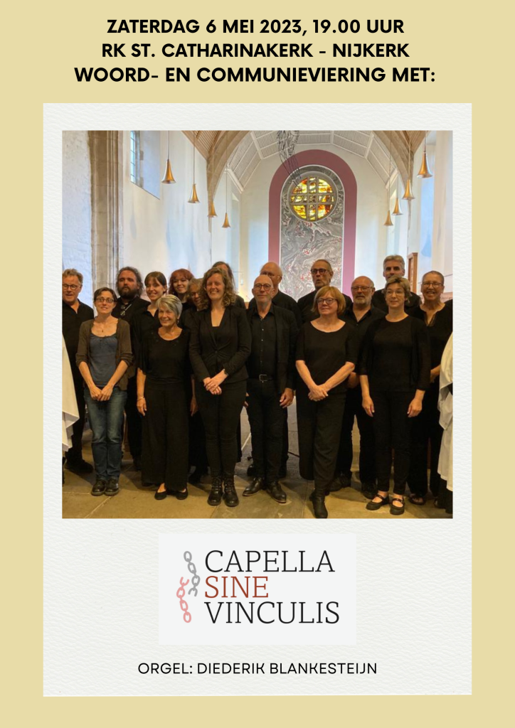 Ontstaan uit de familie Van der Kaaij en niet gebonden aan een bepaalde kerk of locatie: Capella Sine Vinculis, koor zonder banden. Dit vocaal ensemble verzorgt zaterdag 6 mei 2023 de muziek in onze viering. Met medewerking van de Nijkerkse organist Diederik Blankesteijn.